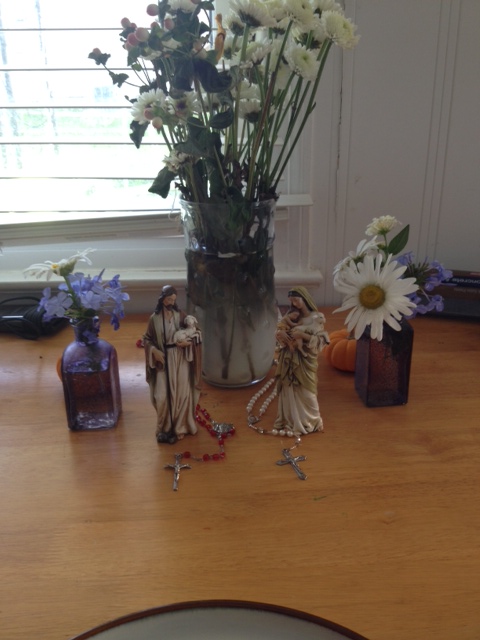 I kept our liturgical celebration simple. I decorated our table with a statue I have of Jesus and another of Our Lady. I don’t have any depictions of Our Lady of the Rosary at this point. I then pulled out a couple of our Rosaries and put them out along with flowers; blue in honor of Our Mother. I explained the feast to my 4 year old while we ate dinner. I made an Israeli Spiced Chicken. I got the idea from this recipe. I didn’t actually grill the chicken. I roasted organic boneless chicken thighs, but I used the marinade in the recipe. It was so delicious! I also made a pearl cous cous salad with tomatoes, bell pepper, and parsley with lemon and olive oil. I sprinkled goat cheese on top, which added a rich creaminess. I didn’t make a dessert. We are trying to eat healthier, so I save desserts for our really big feast days. Pinterest is a great place to find recipes from around the world to use for various feast days. Next week is the feast of St. John Paul II, so I will be searching for Polish recipes. When my husband gets home tonight we will pray the Rosary as a family. It is a quiet, beautiful, and simple celebration of the gift of the Rosary and Our Heavenly Mother.