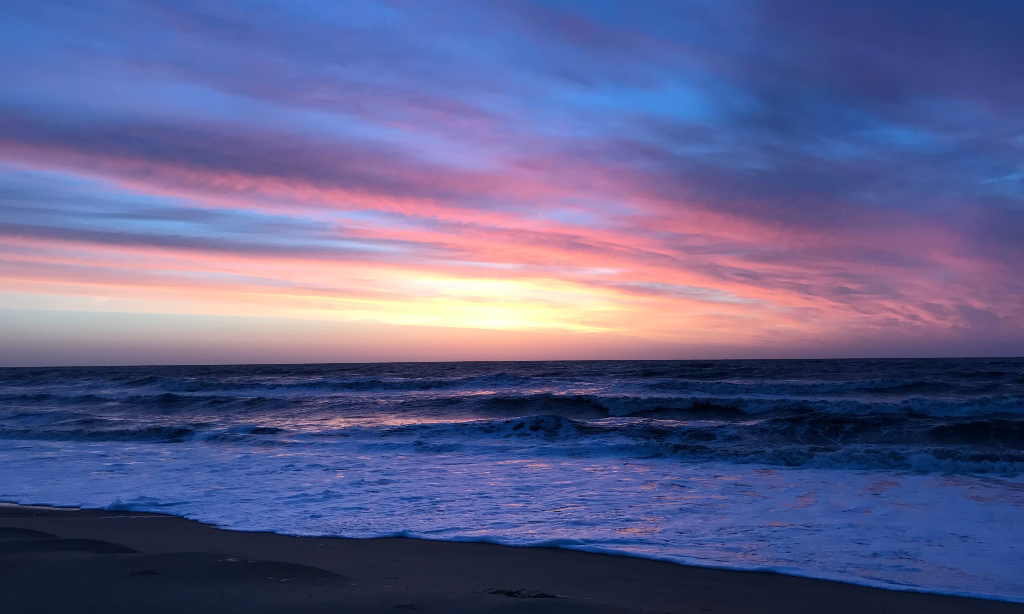 I woke up before sunrise when my husband pulled back the curtains in our beach level hotel room in Virginia Beach. I already planned to wake up early so that I could sit on the beach alone watching the sun rise before our daughter woke up for the day. I’m a morning person anyway, so waking up the 30 minutes early wasn’t a big change. When I looked out and saw the early dawn colors along the horizon above the crashing waves, I quickly grabbed my sandals and chair and went out the sliding glass doors to the beach.